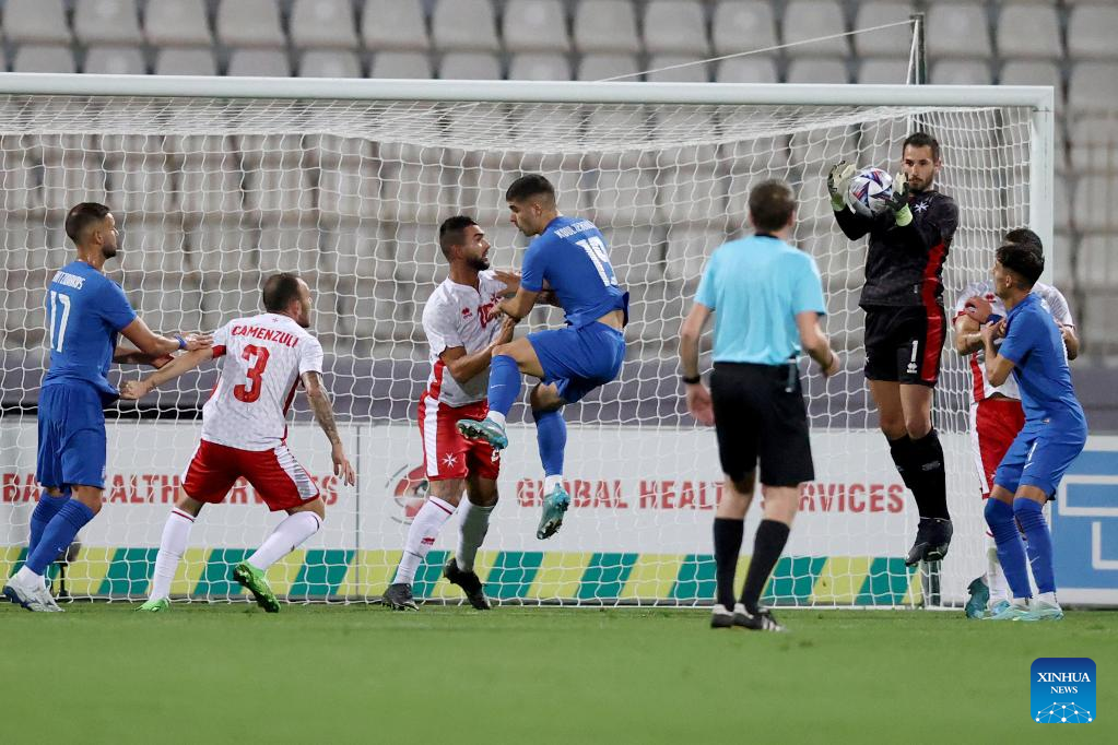 Malta's goalkeeper Henry Bonello (3rd R) clutches the ball during an international friendly match between Malta and Greece at the National Stadium, Attard, Malta, Nov. 17, 2022. (Photo by Jonathan Borg/Xinhua)
