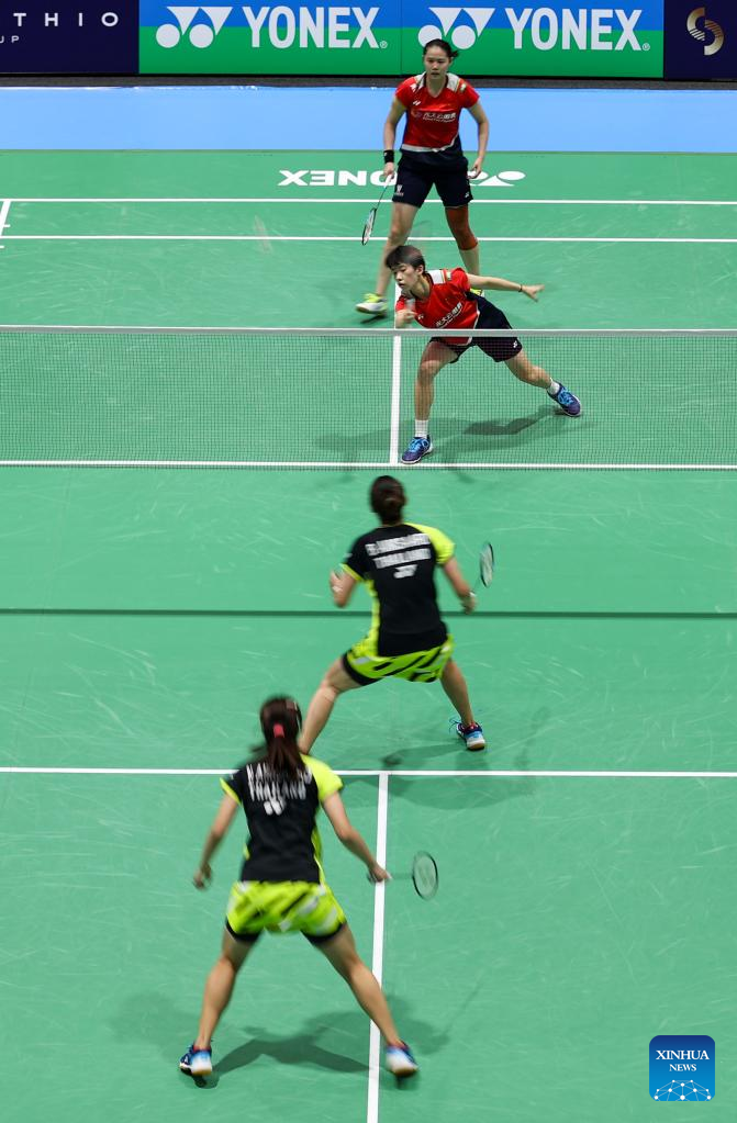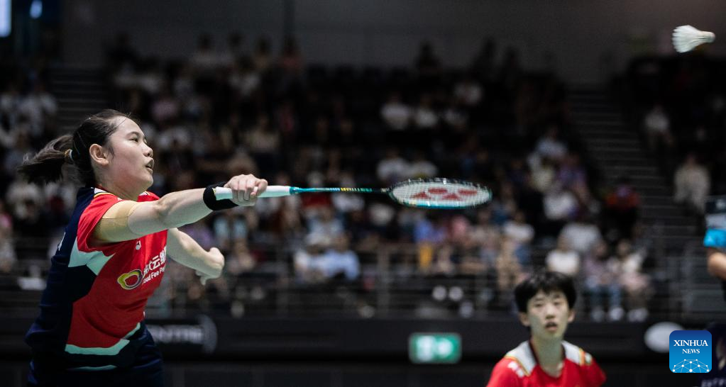 Zhang Shuxian (2nd from top) and Zheng Yu (1st from top) of China compete during women's doubles final match of BWF Australian Open 2022 against Benyapa Aimsaard/Nuntakarn Aimsaard of Thailand in Sydney, Australia, Nov. 20, 2022. (Xinhua/Bai Xuefei)
