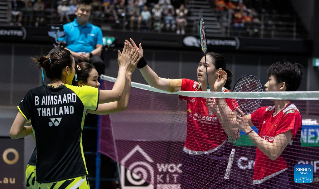 Zhang Shuxian (1st R) and Zheng Yu (2nd R) of China clap hands with Benyapa Aimsaard (1st L)/Nuntakarn Aimsaard of Thailand after the women's doubles final match of BWF Australian Open 2022 in Sydney, Australia, Nov. 20, 2022. (Photo by Hu Jingchen/Xinhua)