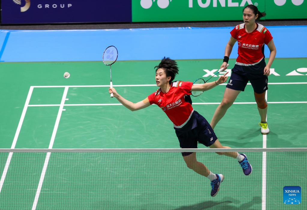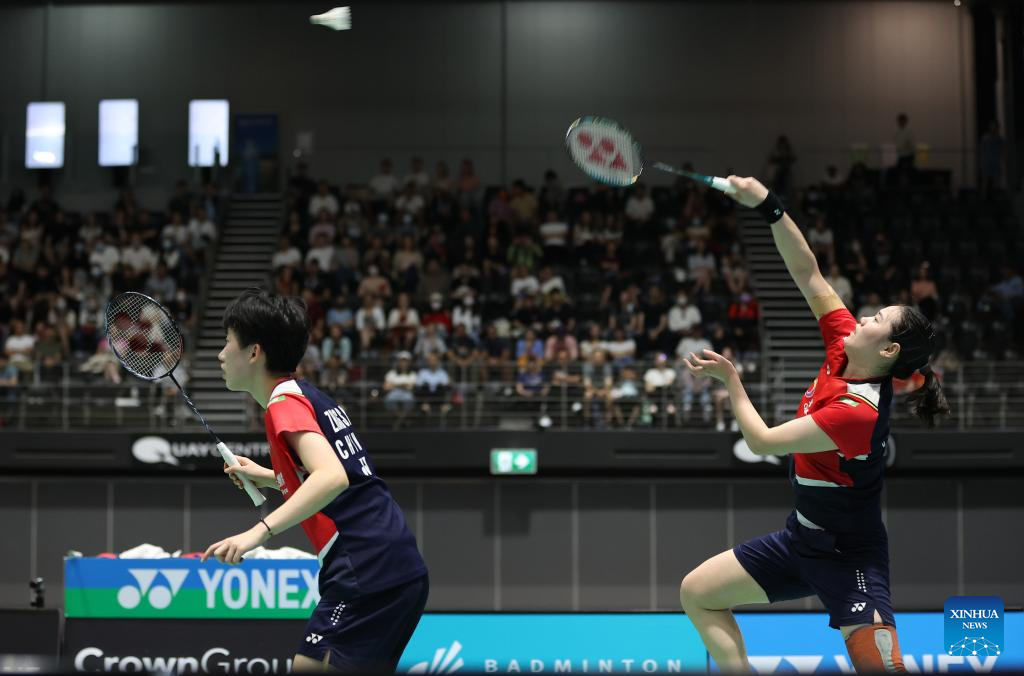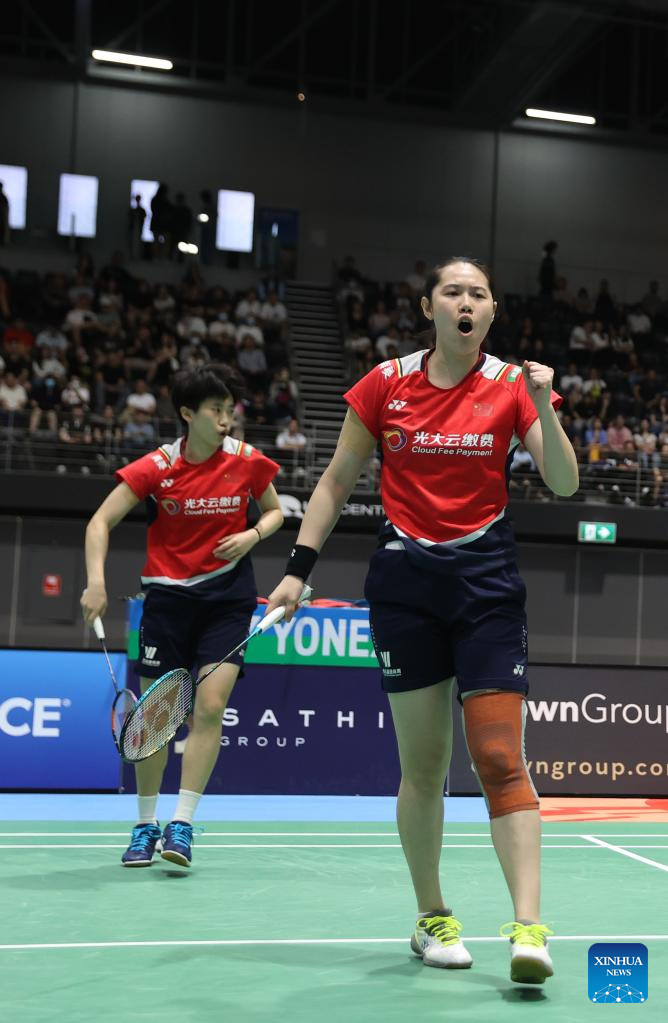 Zhang Shuxian (L) and Zheng Yu of China compete during women's doubles final match of BWF Australian Open 2022 against Benyapa Aimsaard/Nuntakarn Aimsaard of Thailand in Sydney, Australia, Nov. 20, 2022. (Xinhua/Bai Xuefei)