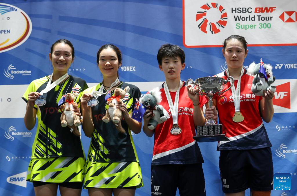 Zhang Shuxian (2nd R)/Zheng Yu (1st R) of China and Benyapa Aimsaard (1st L)/Nuntakarn Aimsaard of Thailand pose during the awarding ceremony after the women's doubles final match of BWF Australian Open 2022 in Sydney, Australia, Nov. 20, 2022. (Xinhua/Bai Xuefei)