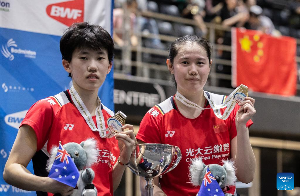 Zhang Shuxian (L) and Zheng Yu of China pose during the awarding ceremony after the women's doubles final match of BWF Australian Open 2022 against Benyapa Aimsaard/Nuntakarn Aimsaard of Thailand in Sydney, Australia, Nov. 20, 2022. (Xinhua/Bai Xuefei)