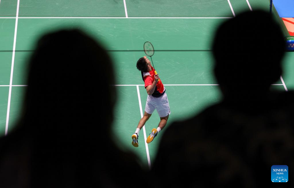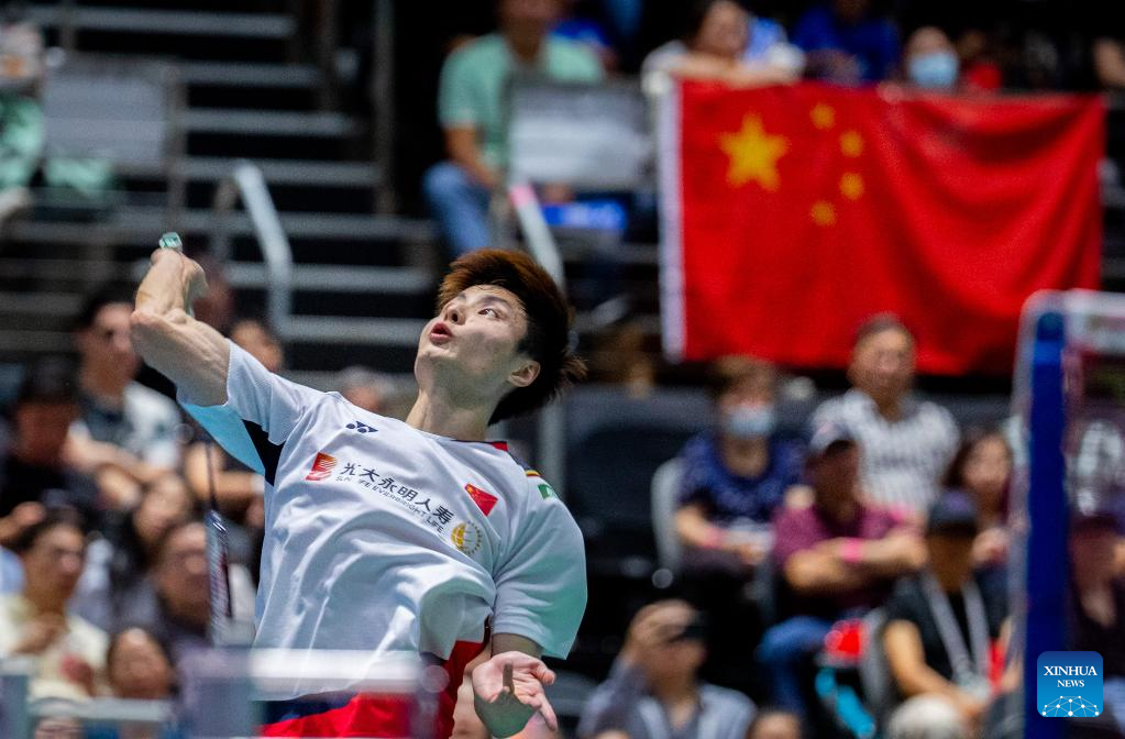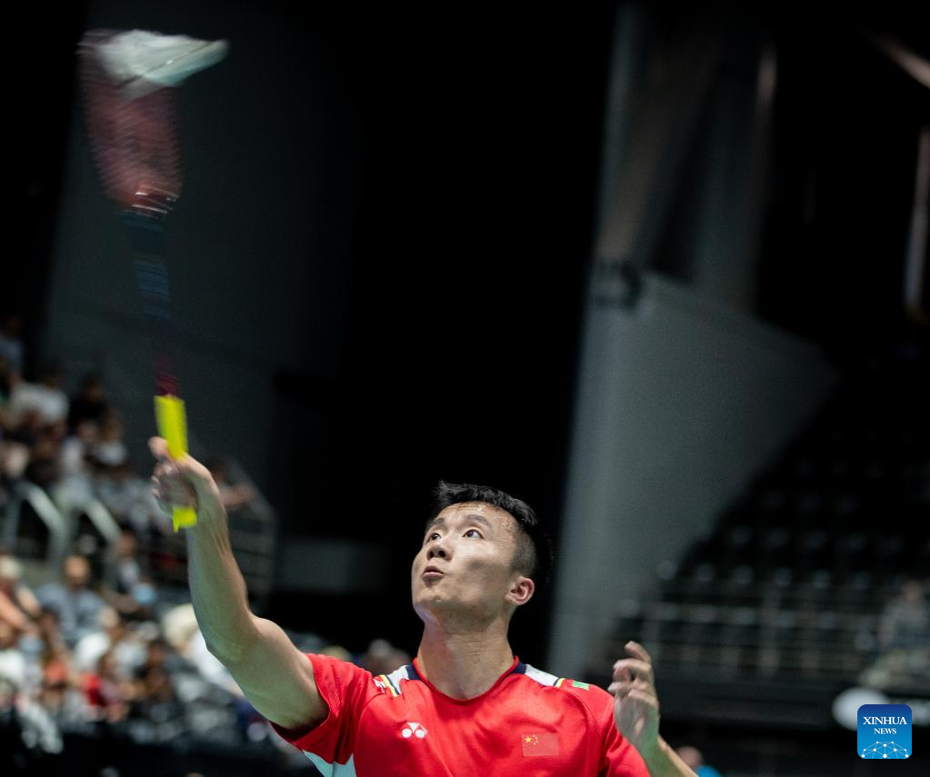 Lu Guangzu of China competes during the men's singles final match of BWF Australian Open 2022 against Shi Yuqi of China in Sydney, Australia, Nov. 20, 2022. (Xinhua/Bai Xuefei)