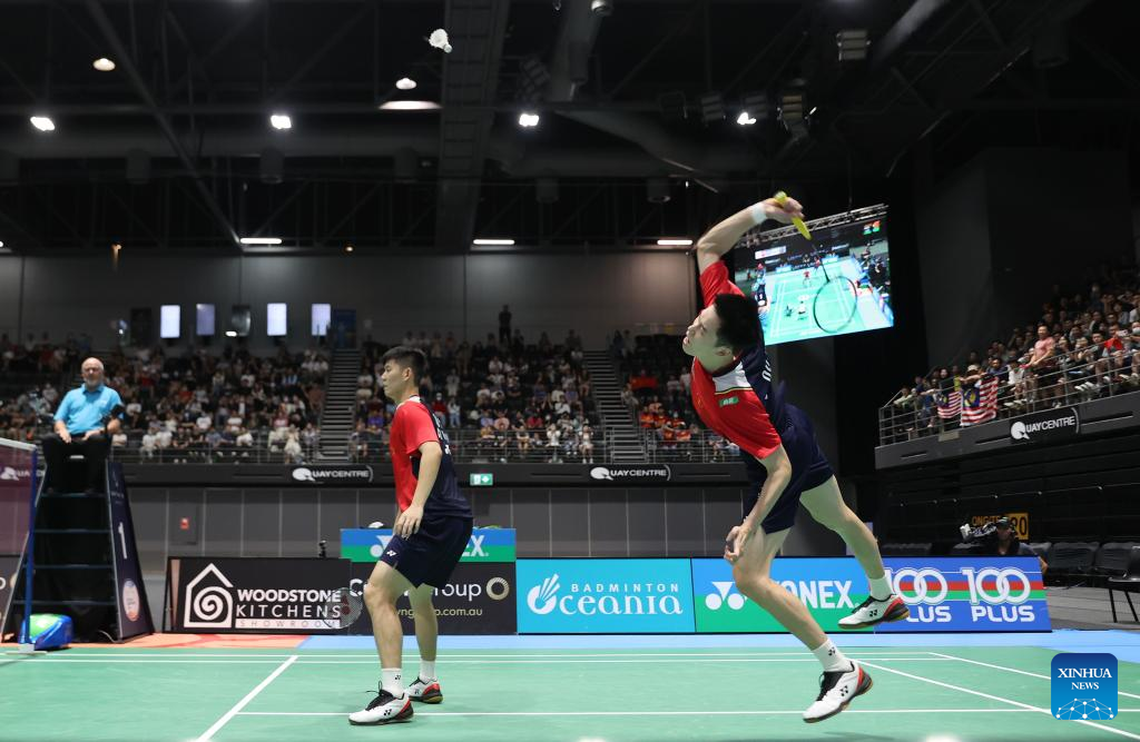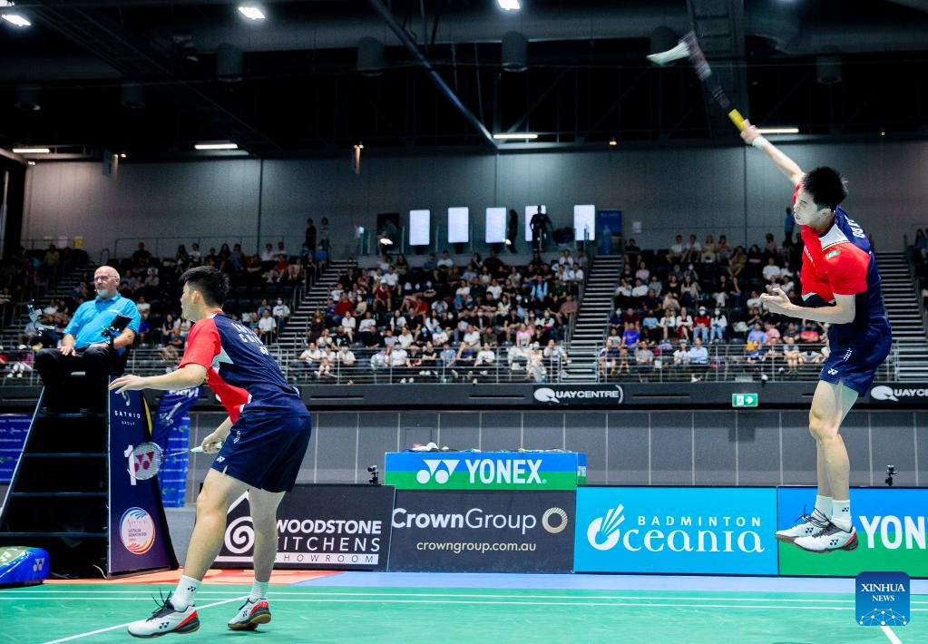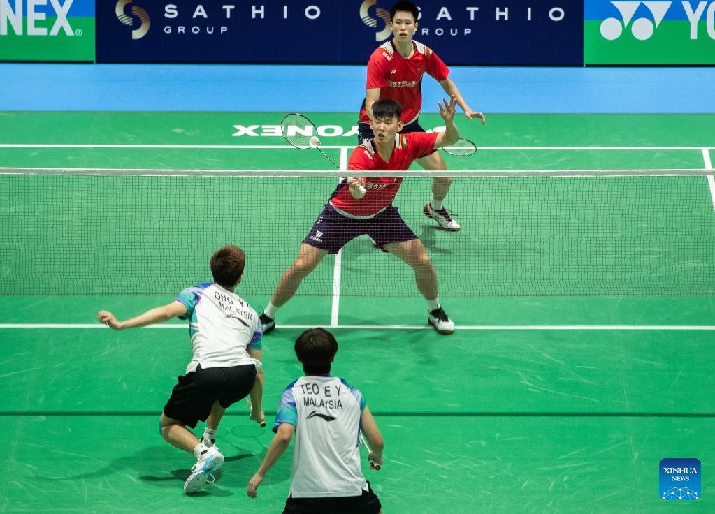 Liu Yuchen/Ou Xuanyi (R) of China compete during men's doubles final match of BWF Australian Open 2022 against Ong Yew Sin/Teo Ee Yi of Malaysia in Sydney, Australia, Nov. 20, 2022. (Xinhua/Bai Xuefei)