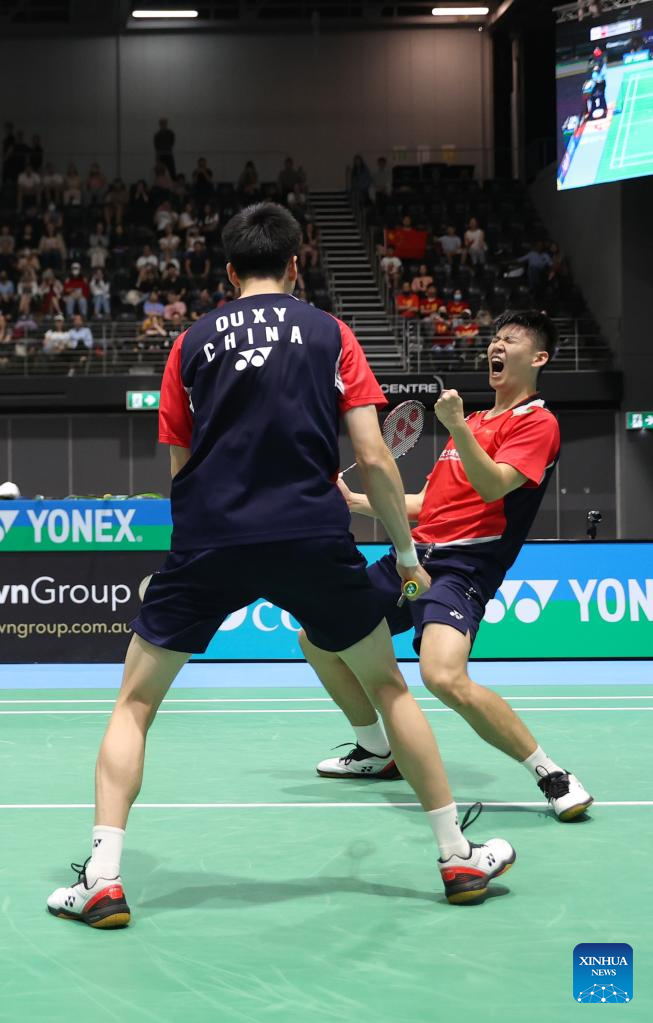 Liu Yuchen (R)/Ou Xuanyi of China celebrate winning men's doubles final match of BWF Australian Open 2022 against Ong Yew Sin/Teo Ee Yi of Malaysia in Sydney, Australia, Nov. 20, 2022. (Xinhua/Bai Xuefei)