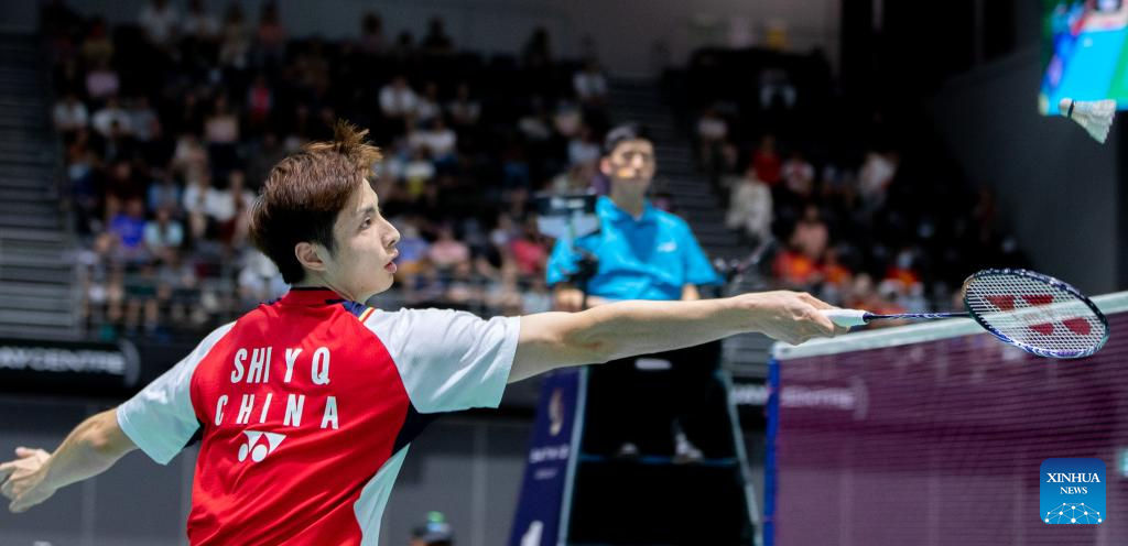 Shi Yuqi of China competes during the men's singles final match of BWF Australian Open 2022 against Lu Guangzu of China in Sydney, Australia, Nov. 20, 2022. (Photo by Hu Jingchen/Xinhua)