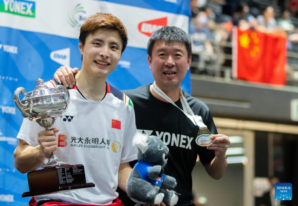 Shi Yuqi (L) of China poses with coach Sun Jun after men's singles final match of BWF Australian Open 2022 against Lu Guangzu of China in Sydney, Australia, Nov. 20, 2022. (Photo by Hu Jingchen/Xinhua)