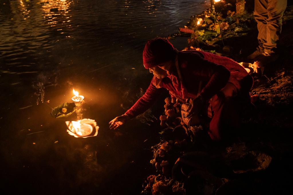 People float oil lamps as a tradition to observe the Bala Chaturdashi Festival in Kathmandu, Nepal, Nov. 22, 2022. (Photo by Hari Maharjan/Xinhua)