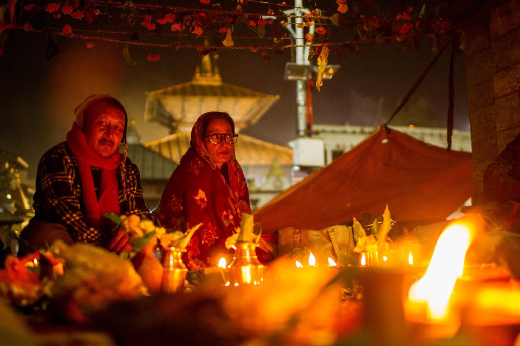 People sit beside oil lamps during the Bala Chaturdashi Festival at the Pashupatinath Temple in Kathmandu, Nepal, Nov. 21, 2022. (Photo by Sulav Shrestha/Xinhua)
