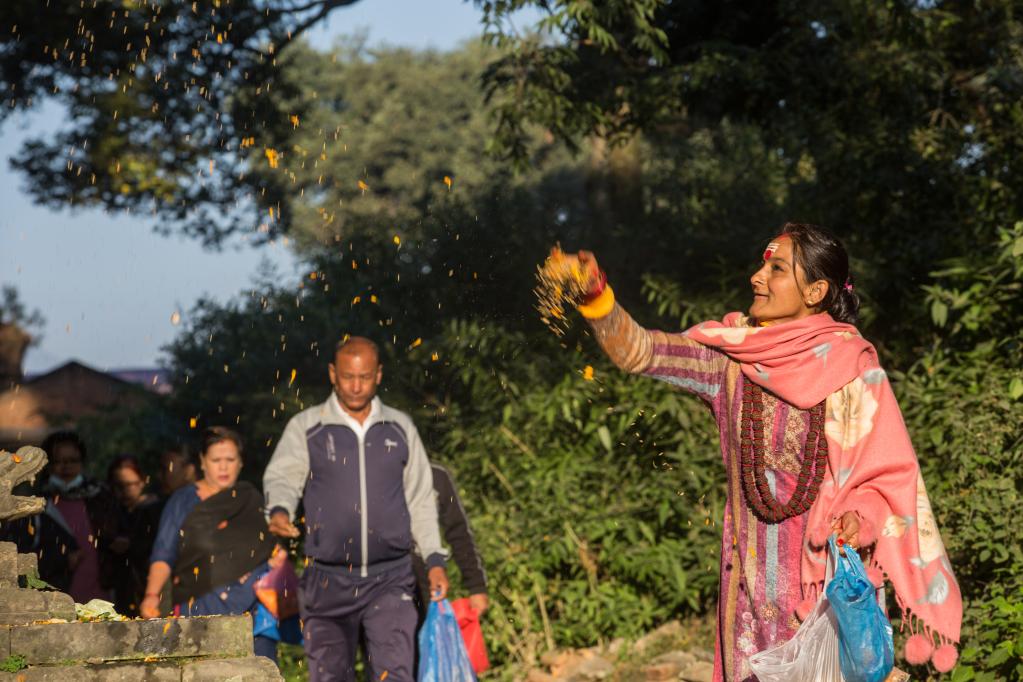 People scatter a mixture of seven types of grains as a tradition to observe the Bala Chaturdashi Festival in Kathmandu, Nepal, Nov. 22, 2022. (Photo by Hari Maharjan/Xinhua)