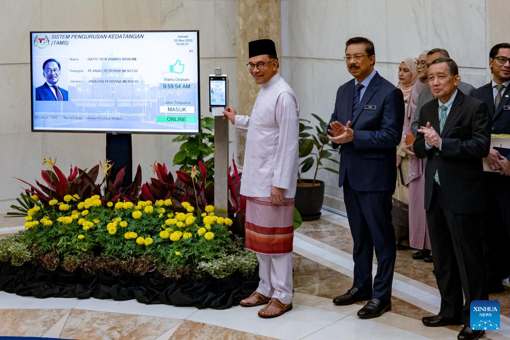 Malaysia's new Prime Minister Anwar Ibrahim (1st L) clocks in at the prime minister's office in Putrajaya, Malaysia, Nov. 25, 2022. Anwar, a former deputy prime minister, took the oath of office on Thursday to become Malaysia's new prime minister. (Malaysian Prime Minister's Office/Handout via Xinhua)