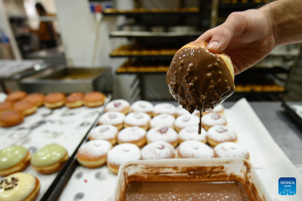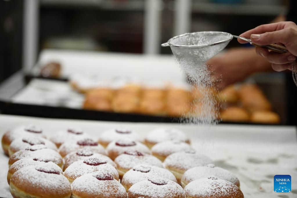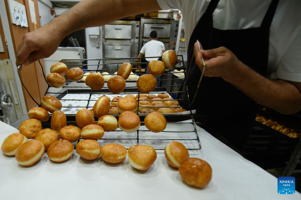 A bakery worker makes sufganiyot, round jelly donuts eaten during the Jewish festival of Hanukkah, at a bakery in Kiryat Shmona, northern Israel, on Dec. 14, 2022. (Ayal Maragolin/JINI via Xinhua)