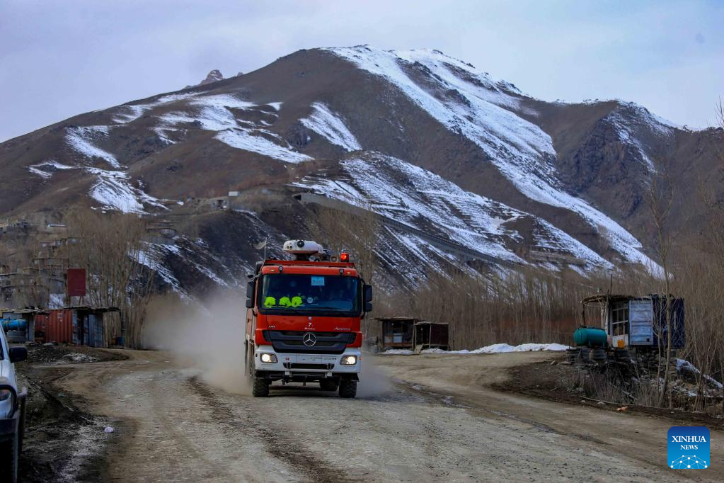 Photo taken on Dec. 19, 2022 shows a fire truck on the way to an oil tanker blast site in Parwan province, Afghanistan. The death toll from an oil tanker blast in a tunnel in Afghanistan's eastern Parwan province reached 19, Deputy to Provincial Health Directorate Abdullah Afghanmal said Sunday. (Photo by Zahir khan Zahir/Xinhua)