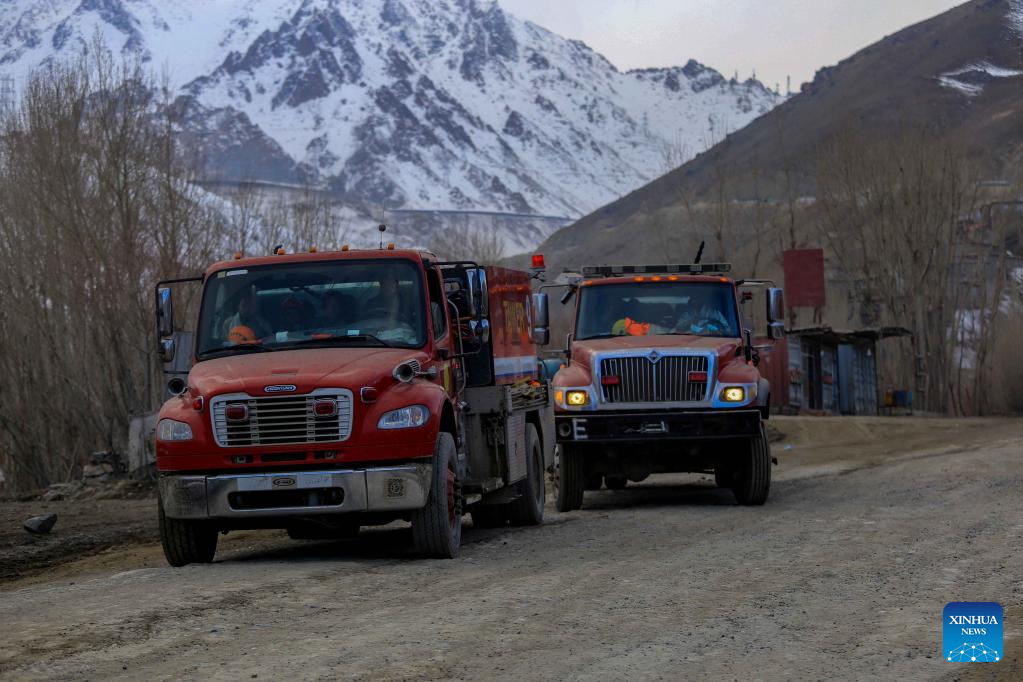Photo taken on Dec. 19, 2022 shows fire trucks on the way to an oil tanker blast site in Parwan province, Afghanistan. The death toll from an oil tanker blast in a tunnel in Afghanistan's eastern Parwan province reached 19, Deputy to Provincial Health Directorate Abdullah Afghanmal said Sunday. (Photo by Zahir khan Zahir/Xinhua)