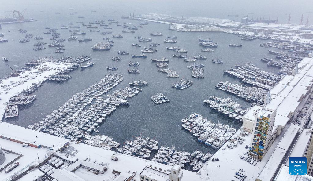 This aerial photo taken on Dec. 22, 2022 shows fishing boats berthing in the snow at Shidao fishing port in Rongcheng, east China's Shandong Province. (Photo by Li Xinjun/Xinhua)
