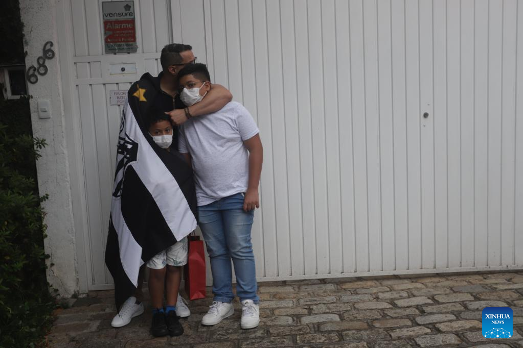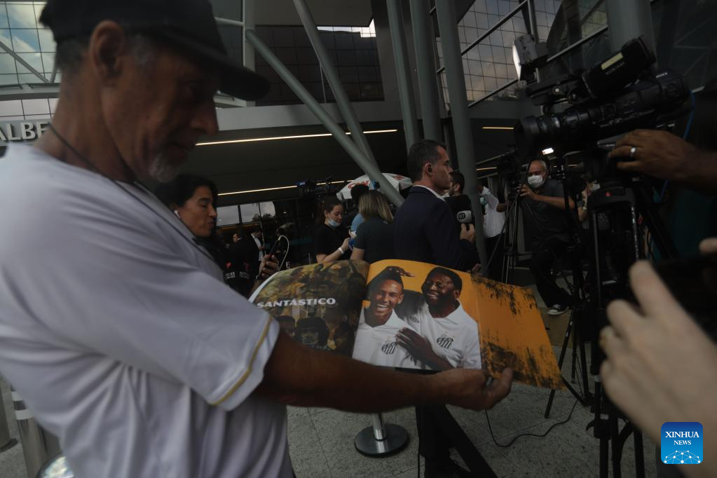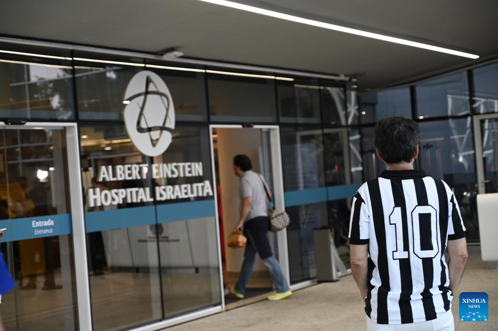 People gather outside the Israelita Albert Einstein Hospital where former Brazilian football star Edson Arantes do Nascimento, Pele, died in Sao Paulo, Brazil, on Dec. 29, 2022. Pele, three-time World Cup champion, died on Thursday at the age of 82 in the hospital, victim of colon cancer, his doctors officially reported. (Xinhua/Rahel Patrasso)