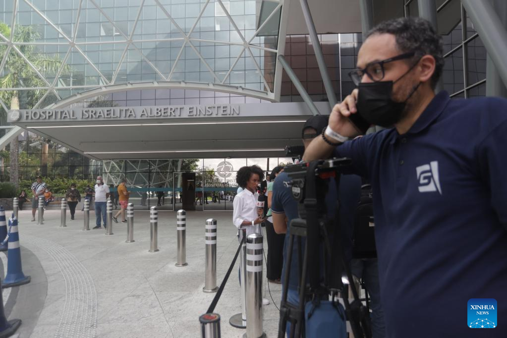 People stand near the Israelita Albert Einstein Hospital where former Brazilian football star Edson Arantes do Nascimento, Pele, died in Sao Paulo, Brazil, on Dec. 29, 2022. Pele, three-time World Cup champion, died on Thursday at the age of 82 in the hospital, victim of colon cancer, his doctors officially reported. (Xinhua/Rahel Patrasso)