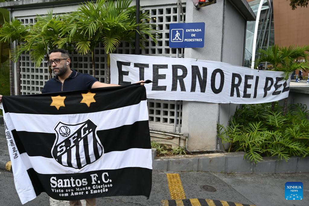 A man shows a flag of Santos F.C. outside the Israelita Albert Einstein Hospital where former Brazilian football star Edson Arantes do Nascimento, Pele, died in Sao Paulo, Brazil, on Dec. 29, 2022. Pele, three-time World Cup champion, died on Thursday at the age of 82 in the hospital, victim of colon cancer, his doctors officially reported. (Xinhua/Chen Haoquan)