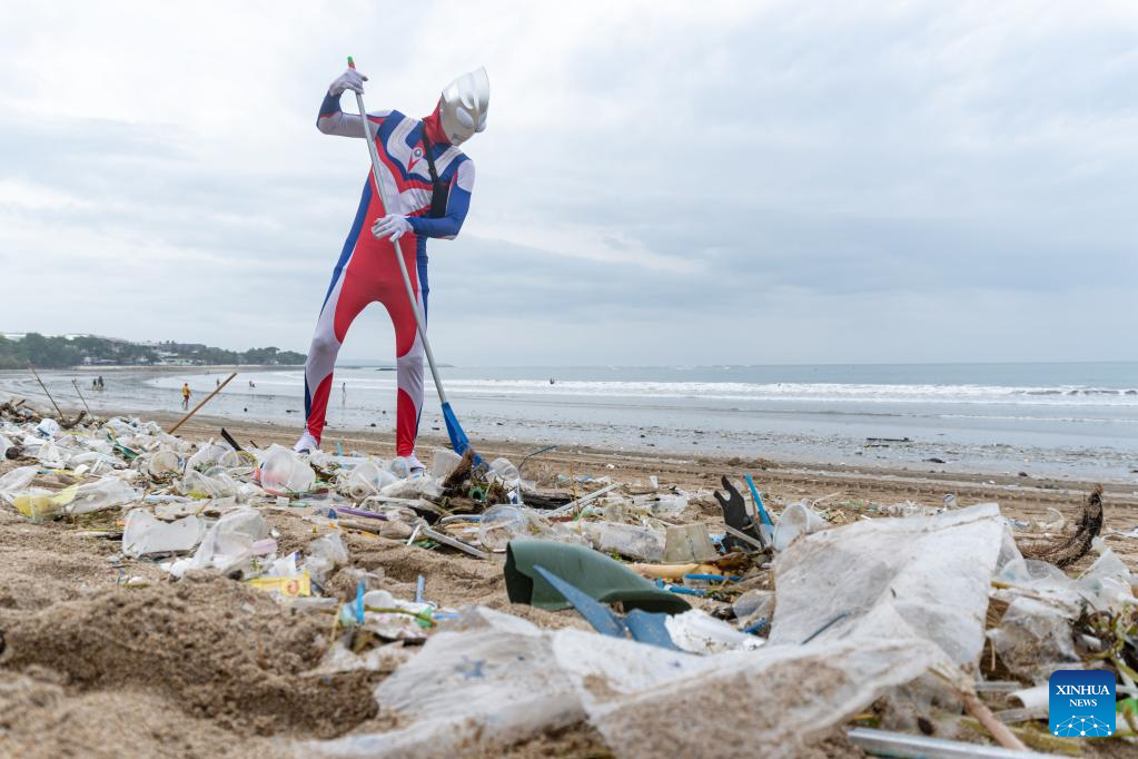 A volunteer wearing a costume of the Japanese fictional superhero Ultraman cleans trash at Kuta Beach in Bali, Indonesia, Dec. 30, 2022. (Photo by Dicky Bisinglasi/Xinhua)