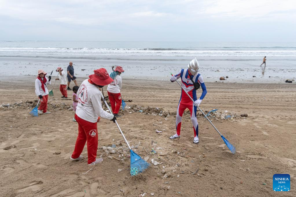 A volunteer wearing a costume of the Japanese fictional superhero Ultraman cleans trash with workers at Kuta Beach in Bali, Indonesia, Dec. 30, 2022. (Photo by Dicky Bisinglasi/Xinhua)