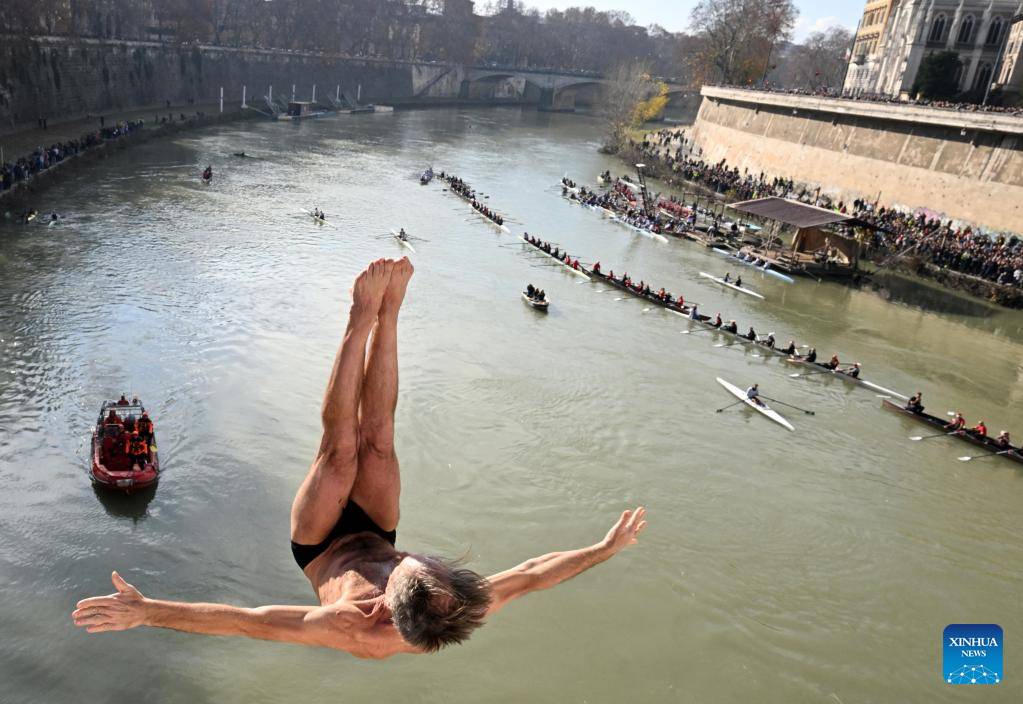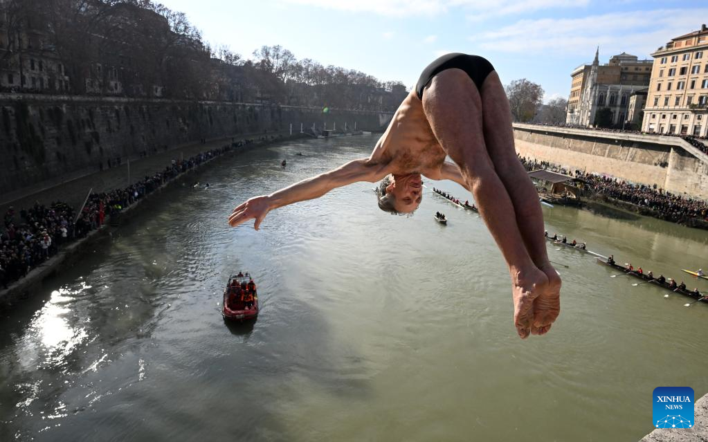 A man dives into the Tiber River from the Ponte Cavour bridge, as a part of traditional New Year celebrations, in Rome, Italy, Jan. 1, 2023. (Photo by Alberto Lingria/Xinhua)