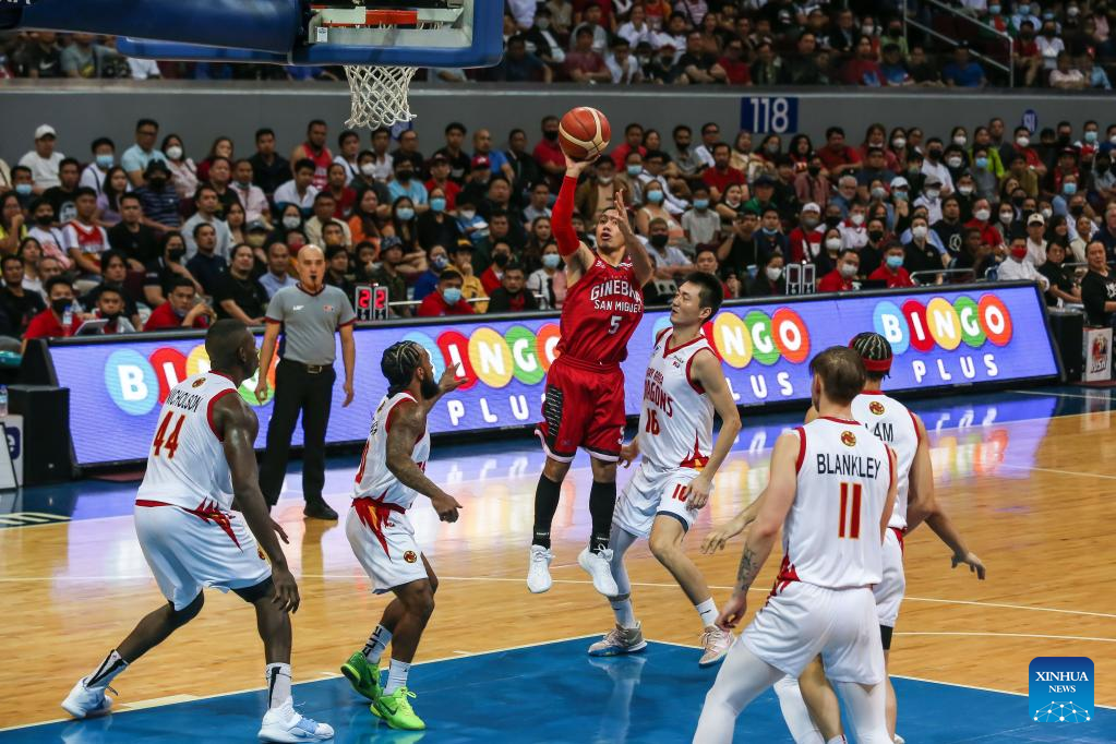 Lewis Alfred Tenorio (C) of Barangay Ginebra San Miguel shoots during the game 3 between Barangay Ginebra San Miguel and Bay Area Dragons at the Commissioner's Cup Finals of the Philippine Basketball Association (PBA) in Pasay City, the Philippines, on January 4, 2023. (Xinhua/Rouelle Umali)