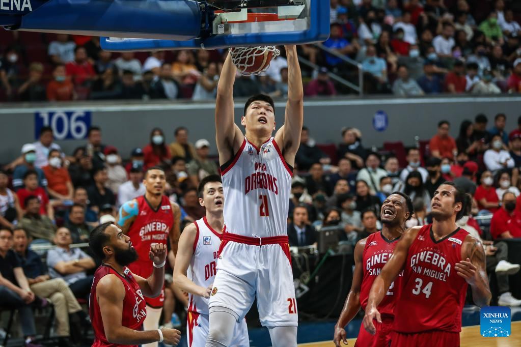 Liu Chuanxing (above) of Bay Area Dragons dunks during the game 3 between Barangay Ginebra San Miguel and Bay Area Dragons at the Commissioner's Cup Finals of the Philippine Basketball Association (PBA) in Pasay City, the Philippines, on January 4, 2023. (Xinhua/Rouelle Umali)