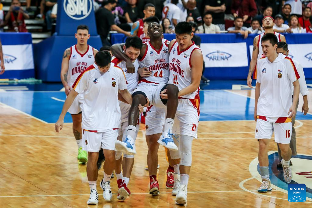 Andrew Fabian Nicholson (C) of Bay Area Dragons is carried out of the court by teammates after getting injured during the game 3 between Barangay Ginebra San Miguel and Bay Area Dragons at the Commissioner's Cup Finals of the Philippine Basketball Association (PBA) in Pasay City, the Philippines, on January 4, 2023. (Xinhua/Rouelle Umali)