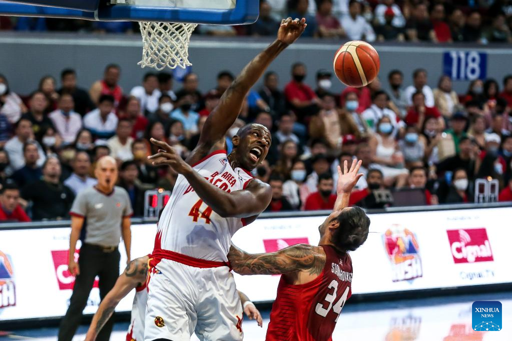 Andrew Fabian Nicholson (L) of Bay Area Dragons vies for the ball during the game 3 between Barangay Ginebra San Miguel and Bay Area Dragons at the Commissioner's Cup Finals of the Philippine Basketball Association (PBA) in Pasay City, the Philippines, on January 4, 2023. (Xinhua/Rouelle Umali)