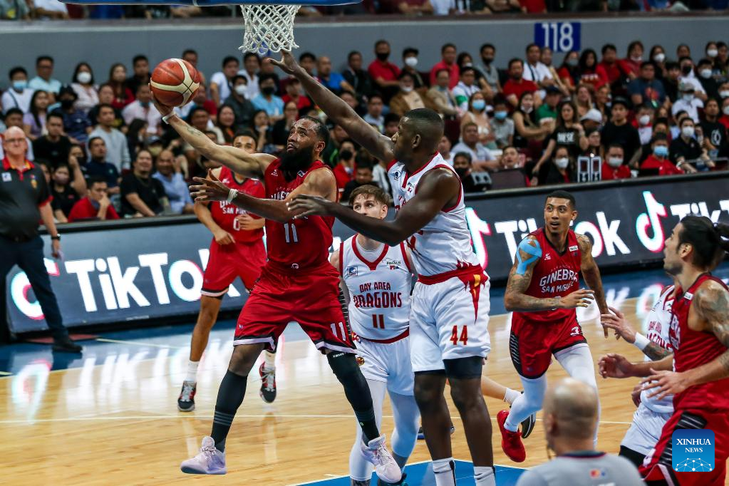 Stanley Jr. Pringle (front L) of Barangay Ginebra San Miguel goes for a lay-up during the game 3 between Barangay Ginebra San Miguel and Bay Area Dragons at the Commissioner's Cup Finals of the Philippine Basketball Association (PBA) in Pasay City, the Philippines, on January 4, 2023. (Xinhua/Rouelle Umali)
