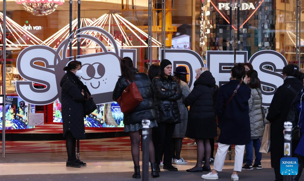 People wait outside a department store on the first day of winter sales in Paris, France, Jan. 11, 2023. France's 2023 winter sales began on Wednesday and will run through Feb. 7, 2023. (Xinhua/Gao Jing)