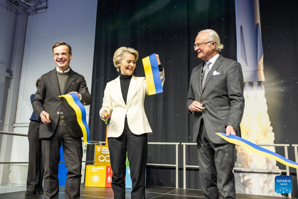 European Commission President Ursula von der Leyen (C), King of Sweden Carl XVI Gustaf (R) and Swedish Prime Minister Ulf Kristersson attend the inauguration ceremony of Spaceport Esrange at the Esrange Space Center in northern Sweden. Spaceport Esrange, mainland Europe's first orbital launch complex, was inaugurated on Friday. (Johannes Frandsen/Swedish Government/Handout via Xinhua)