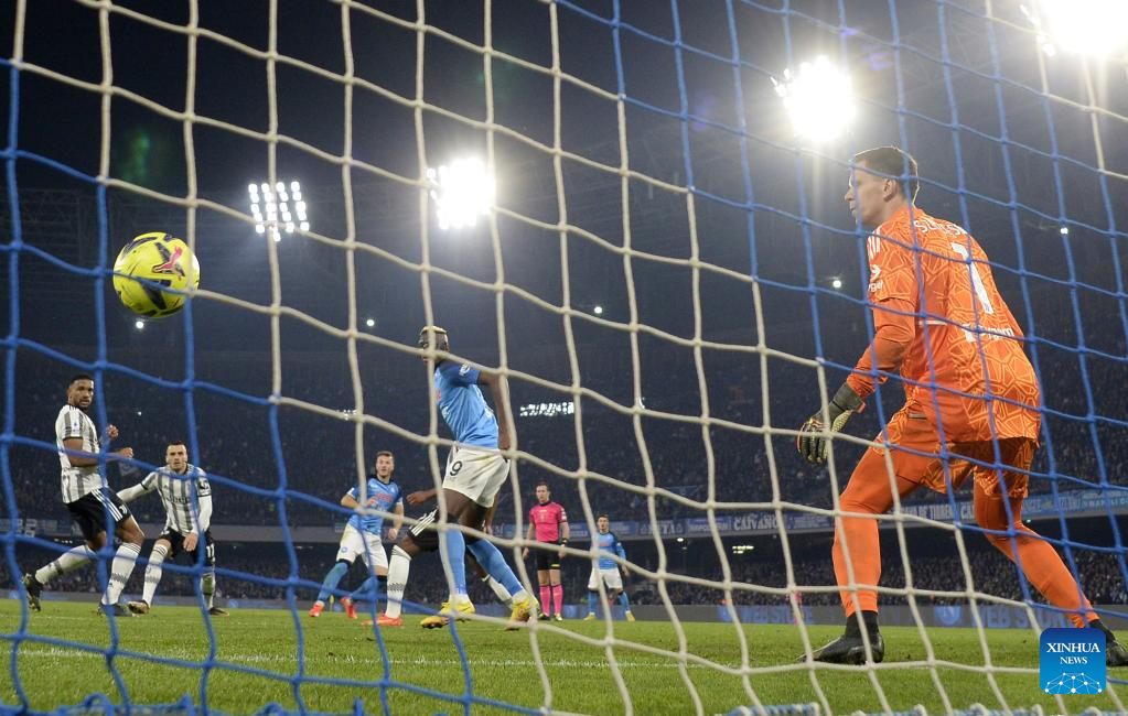 Napoli's Amir Rrahmani (3rd L) scores his goal during a Serie A football match between Napoli and FC Juventus in Naples, Italy, Jan. 13, 2023. (Photo by Alberto Lingria/Xinhua)
