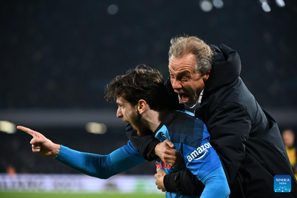 Napoli's Khvicha Kvaratskhelia (L) celebrates his goal during a Serie A football match between Napoli and FC Juventus in Naples, Italy, Jan. 13, 2023. (Photo by Alberto Lingria/Xinhua)
