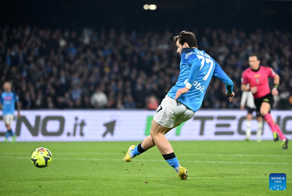 Napoli's Khvicha Kvaratskhelia scores his goal during a Serie A football match between Napoli and FC Juventus in Naples, Italy, Jan. 13, 2023. (Photo by Alberto Lingria/Xinhua)
