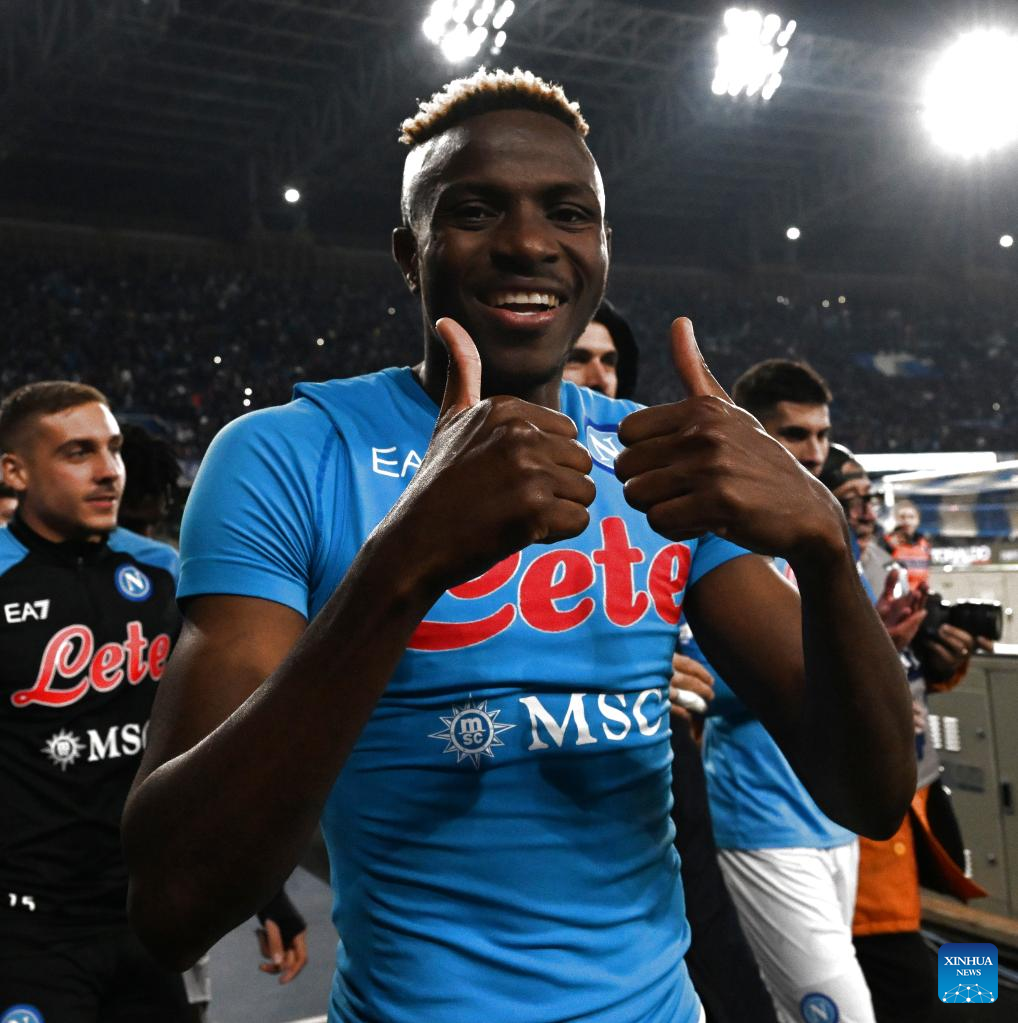 Napoli's Victor Osimhen celebrates the victory after a Serie A football match between Napoli and FC Juventus in Naples, Italy, Jan. 13, 2023. (Photo by Alberto Lingria/Xinhua)