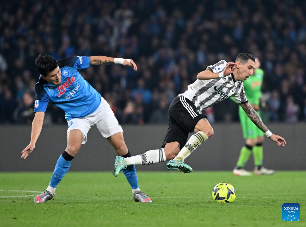 Napoli's Kim Min-Jae (L) vies with FC Juventus Angel Di Maria during a Serie A football match between Napoli and FC Juventus in Naples, Italy, Jan. 13, 2023. (Photo by Alberto Lingria/Xinhua)