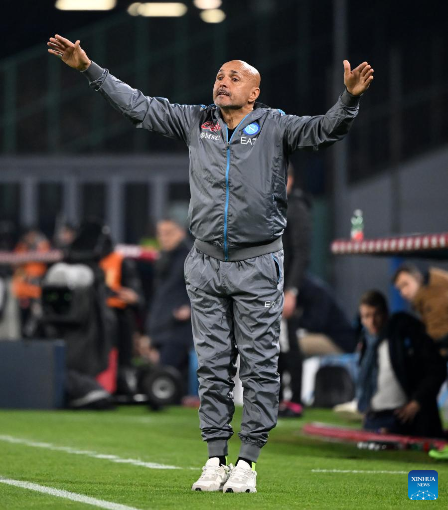 Napoli's head coach Luciano Spalletti gestures during a Serie A football match between Napoli and FC Juventus in Naples, Italy, Jan. 13, 2023. (Photo by Alberto Lingria/Xinhua)