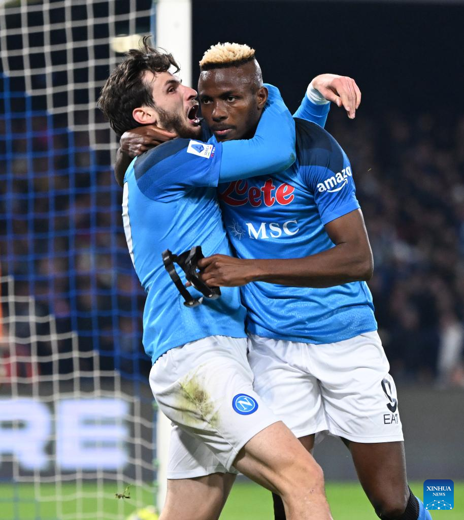 Napoli's Victor Osimhen (R) celebrates his goal with his teammate Khvicha Kvaratskhelia during a Serie A football match between Napoli and FC Juventus in Naples, Italy, Jan. 13, 2023. (Photo by Alberto Lingria/Xinhua)