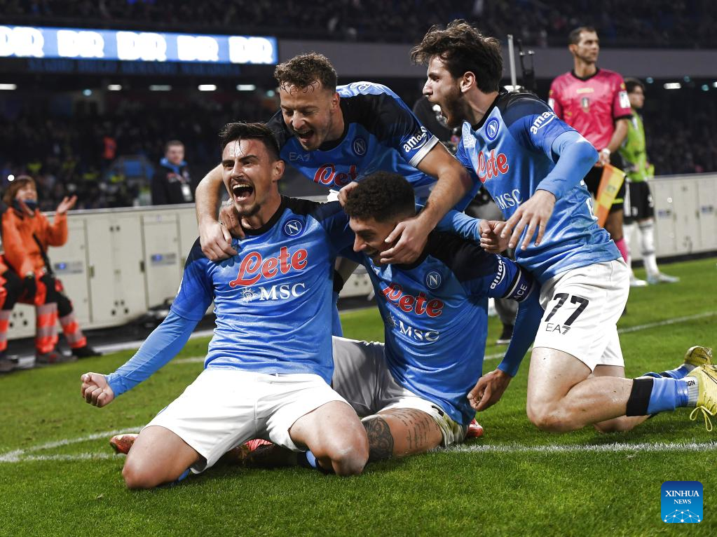 Napoli's Eljif Elmas (1st L) celebrates his goal with his teammates during a Serie A football match between Napoli and FC Juventus in Naples, Italy, Jan. 13, 2023. (Photo by Alberto Lingria/Xinhua)