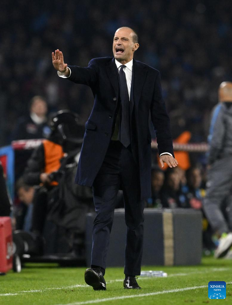 FC Juventus' head coach Massimiliano Allegri gestures during a Serie A football match between Napoli and FC Juventus in Naples, Italy, Jan. 13, 2023. (Photo by Alberto Lingria/Xinhua)