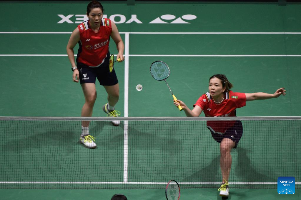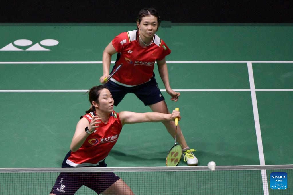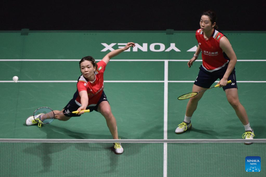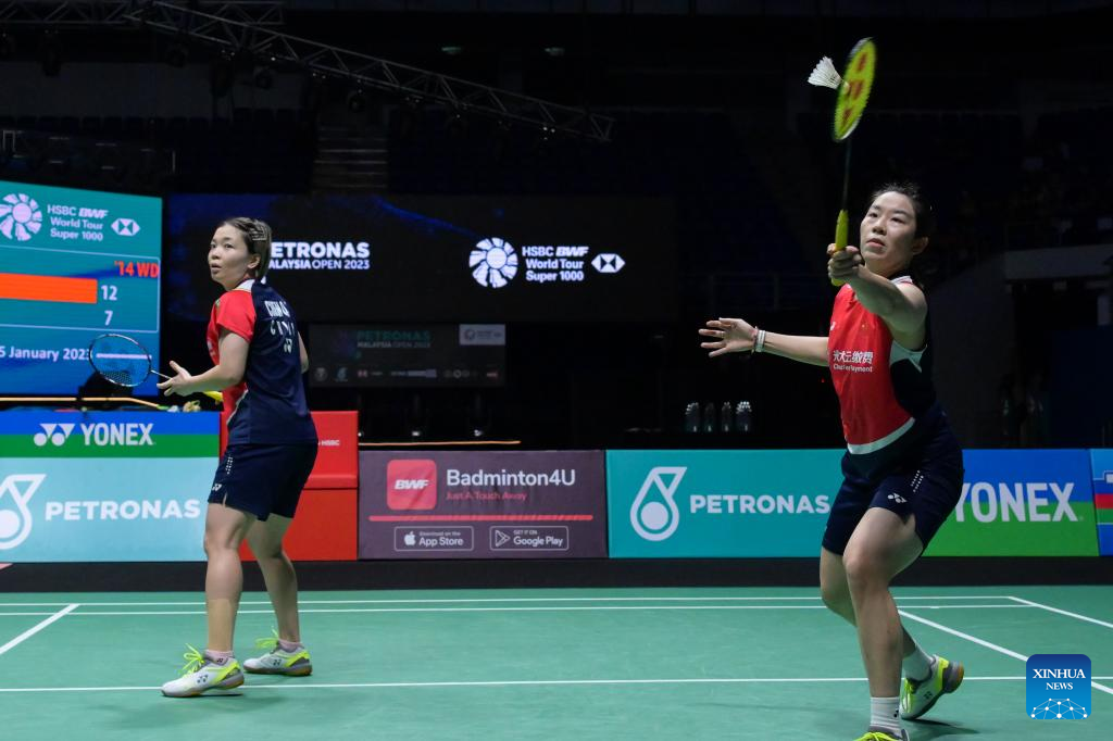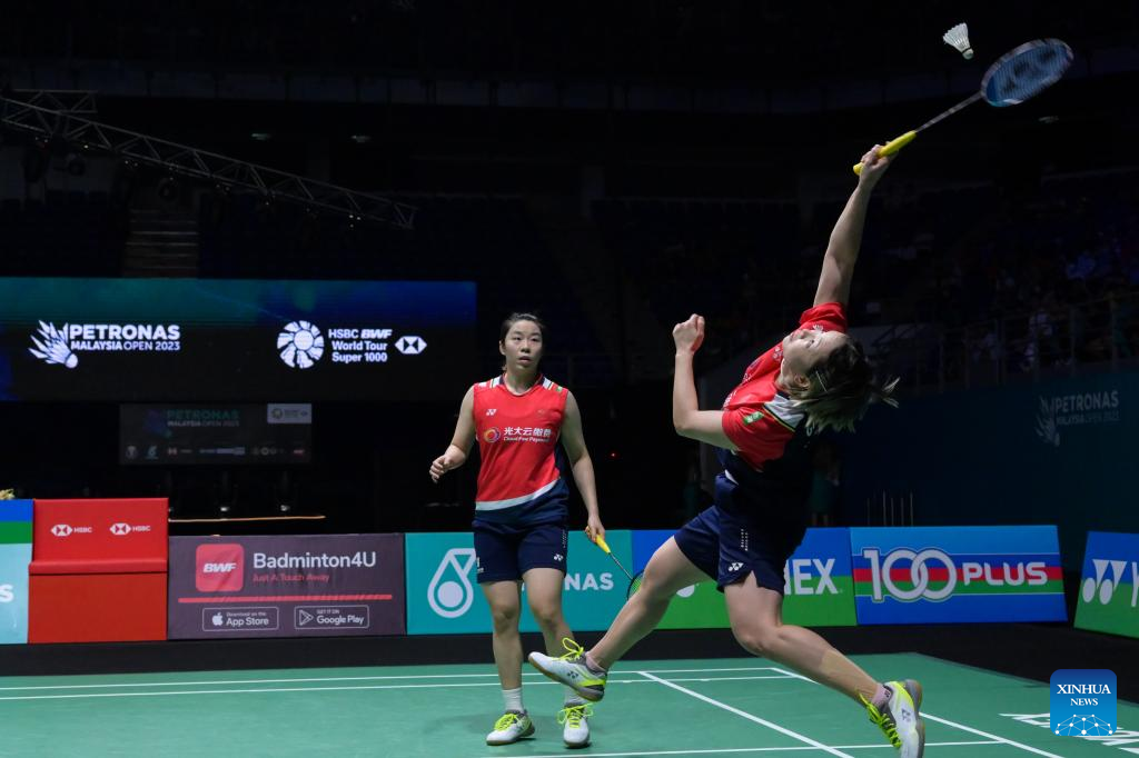 Jia Yifan (L)/Chen Qingchen compete during the women's doubles final match between Chen Qingchen/Jia Yifan of China and Baek Ha Na/Lee Yu Lim of South Korea at Malaysia Open 2023 badminton tournament in Kuala Lumpur, Malaysia, Jan. 15, 2023. (Xinhua/Zhu Wei)