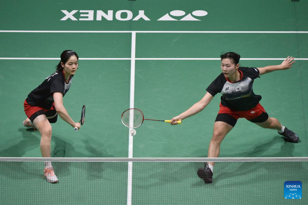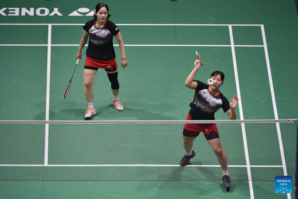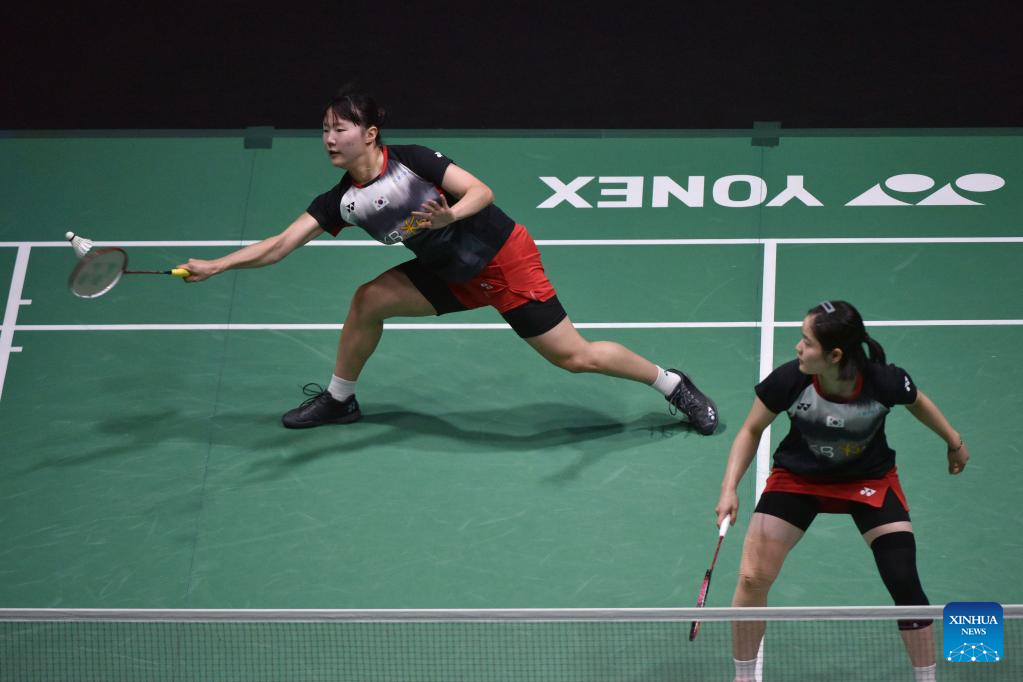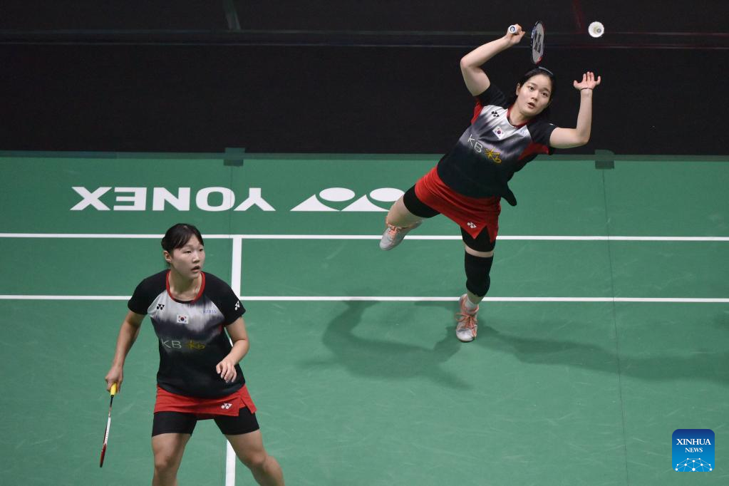 Baek Ha Na (R)/Lee Yu Lim compete during the women's doubles final match between Chen Qingchen/Jia Yifan of China and Baek Ha Na/Lee Yu Lim of South Korea at Malaysia Open 2023 badminton tournament in Kuala Lumpur, Malaysia, Jan. 15, 2023. (Photo by Chong Voon Chung/Xinhua)