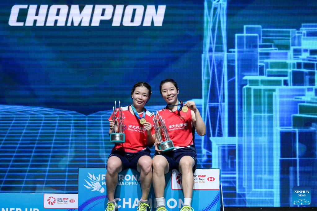 Chen Qingchen (L)/Jia Yifan pose during the medal ceremony after winning the women's doubles final match between Chen Qingchen/Jia Yifan of China and Baek Ha Na/Lee Yu Lim of South Korea at Malaysia Open 2023 badminton tournament in Kuala Lumpur, Malaysia, Jan. 15, 2023. (Xinhua/Zhu Wei)