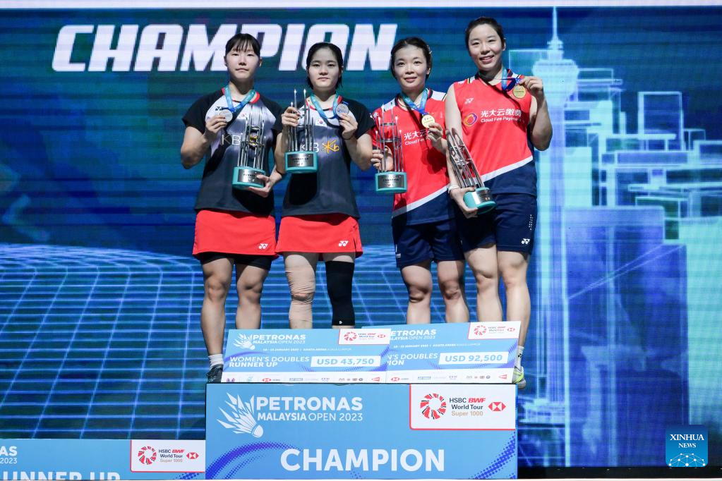 Chen Qingchen (2nd R)/Jia Yifan (1st R) and Baek Ha Na (1st L)/Lee Yu Lim pose during the medal ceremony after their women's doubles final match at Malaysia Open 2023 badminton tournament in Kuala Lumpur, Malaysia, Jan. 15, 2023. (Xinhua/Zhu Wei)