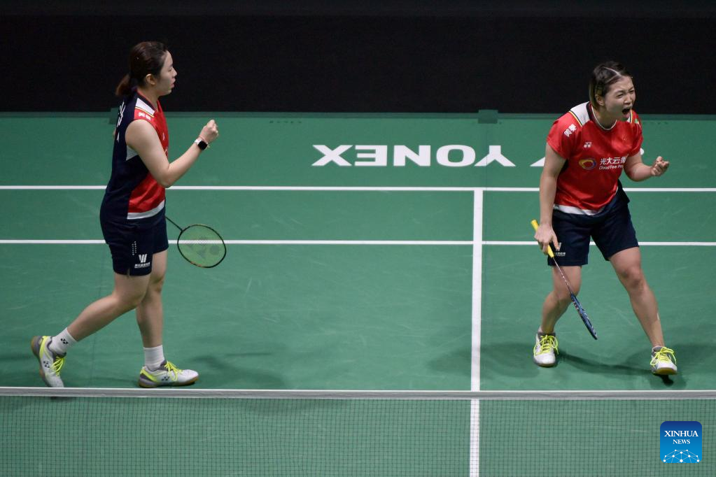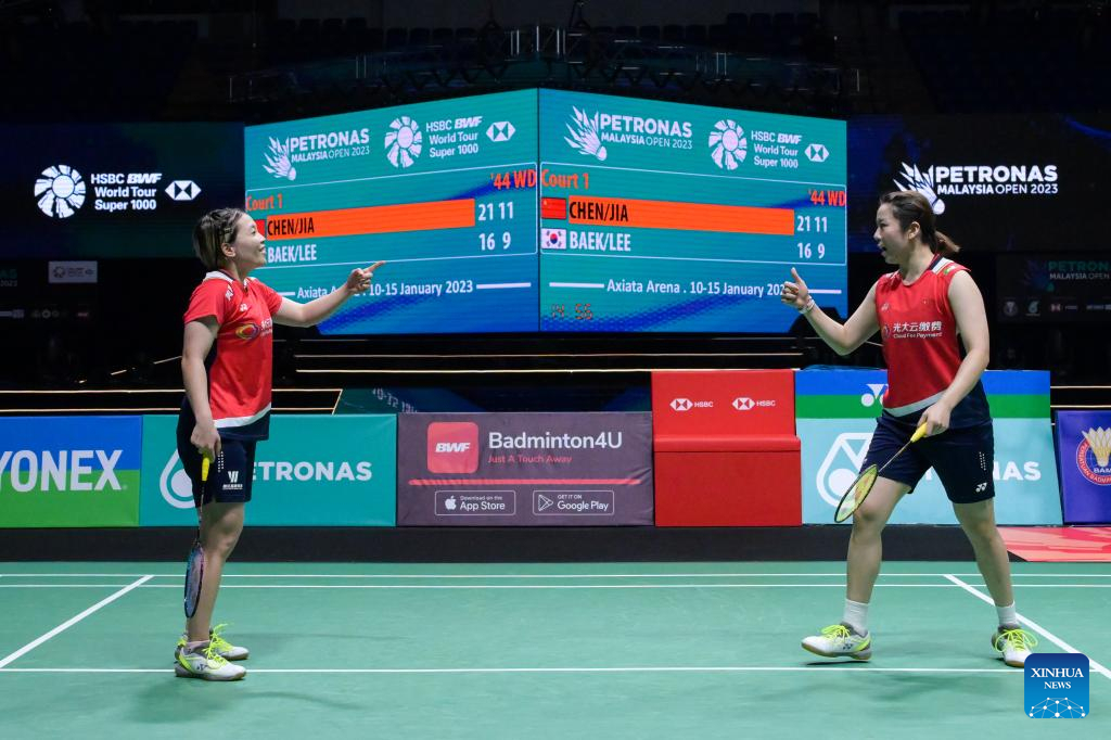 Jia Yifan (L)/Chen Qingchen celebrate scoring during the women's doubles final match between Chen Qingchen/Jia Yifan of China and Baek Ha Na/Lee Yu Lim of South Korea at Malaysia Open 2023 badminton tournament in Kuala Lumpur, Malaysia, Jan. 15, 2023. (Photo by Chong Voon Chung/Xinhua)