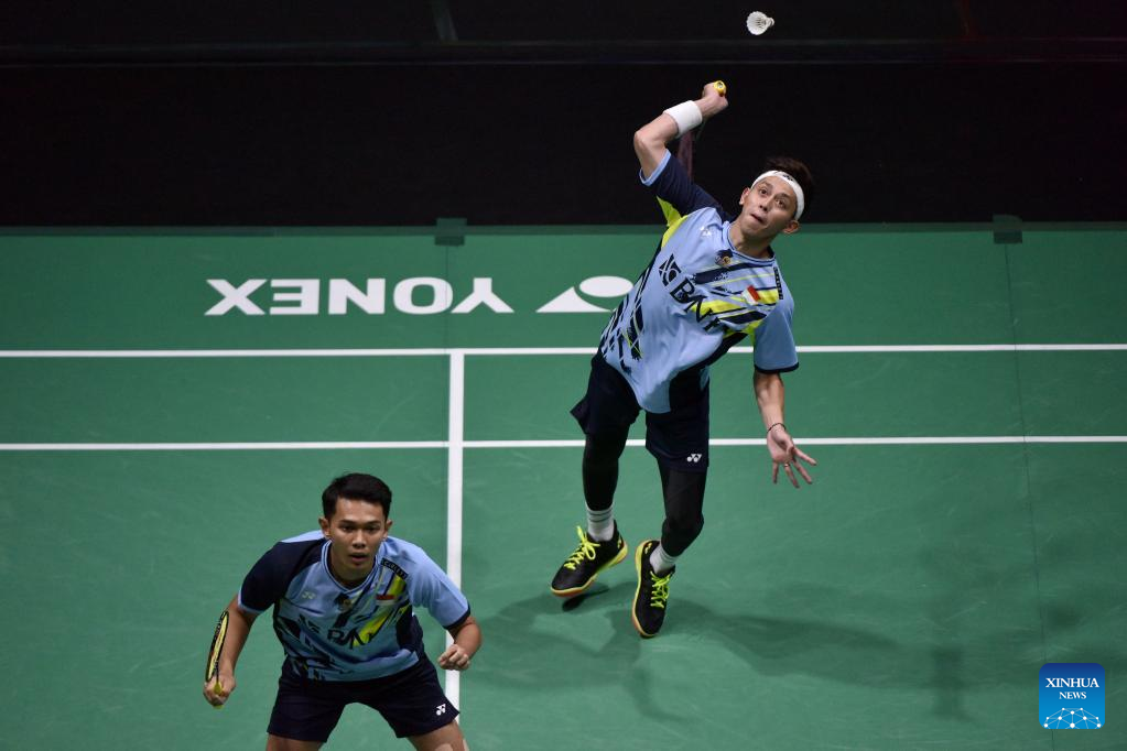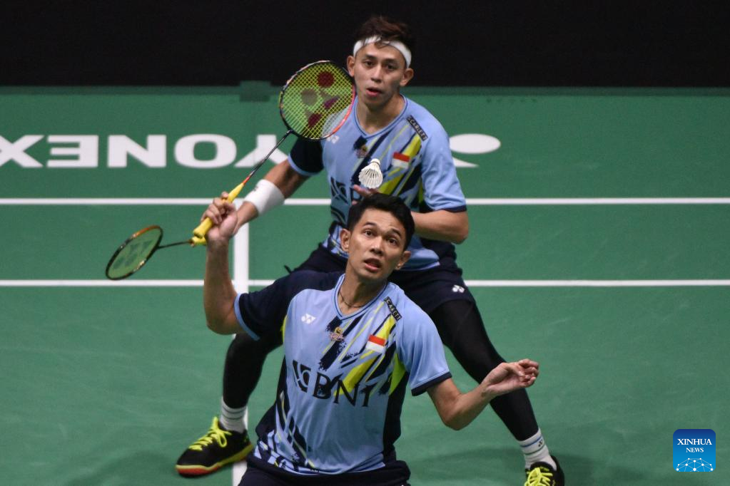 Indonesia's Fajar Alfian/Muhammad Rian Ardianto (R) compete during the men's doubles final match against China's Liang Weikeng/Wang Chang at Malaysia Open 2023 in Kuala Lumpur, Malaysia, Jan. 15, 2023. (Xinhua/Zhu Wei)