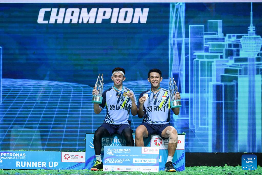 Indonesia's Fajar Alfian (R)/Muhammad Rian Ardianto pose for photos during the awarding ceremony for the men's doubles at Malaysia Open 2023 in Kuala Lumpur, Malaysia, Jan. 15, 2023. (Xinhua/Zhu Wei)