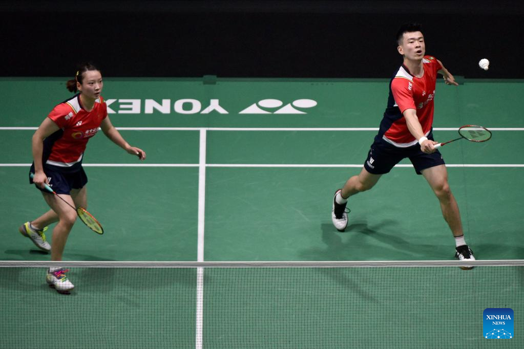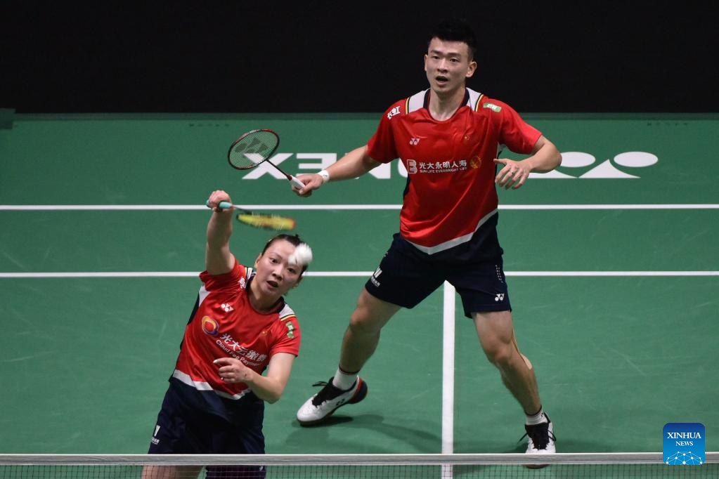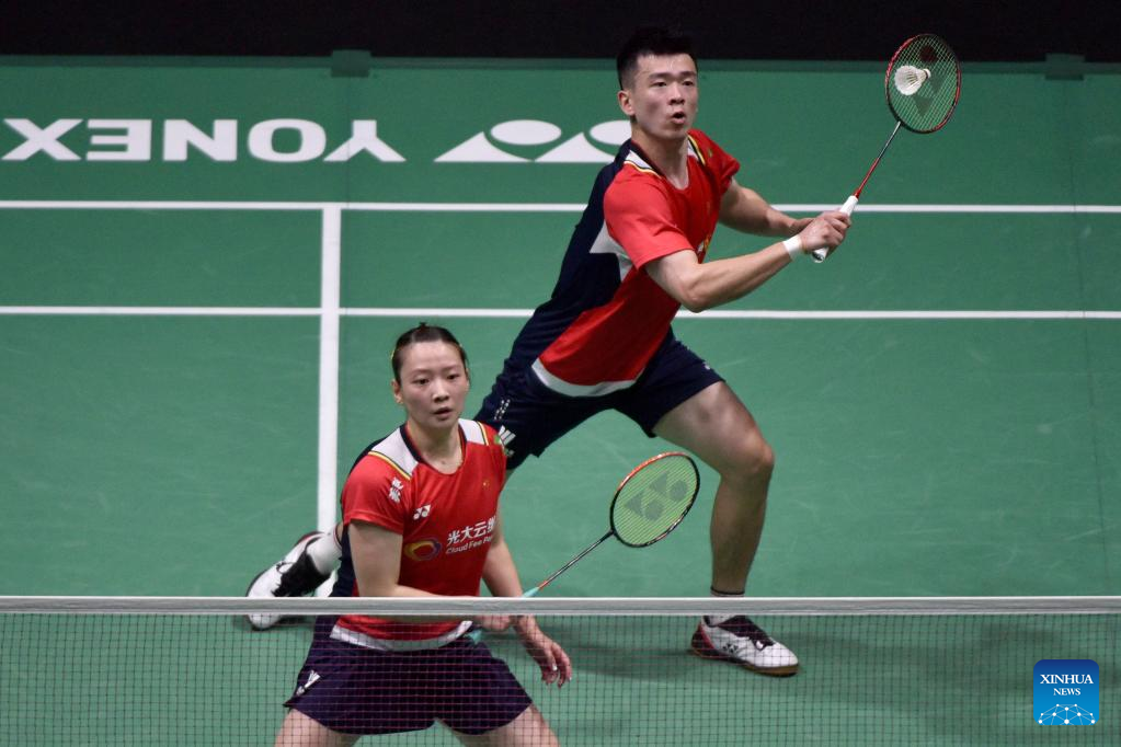 Zheng Siwei (R)/Huang Yaqiong compete during the mixed doubles final match between Zheng Siwei/Huang Yaqiong of China and Watanabe Yuta/Higashino Arisa of Japan at Malaysia Open 2023 badminton tournament in Kuala Lumpur, Malaysia, Jan. 15, 2023. (Photo by Chong Voon Chung/Xinhua)
