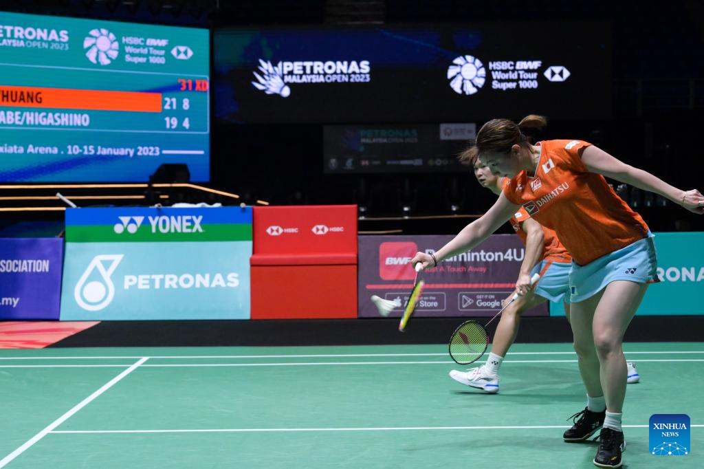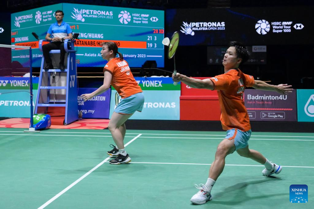 Watanabe Yuta (rear)/Higashino Arisa compete during the mixed doubles final match between Zheng Siwei/Huang Yaqiong of China and Watanabe Yuta/Higashino Arisa of Japan at Malaysia Open 2023 badminton tournament in Kuala Lumpur, Malaysia, Jan. 15, 2023. (Xinhua/Zhu Wei)